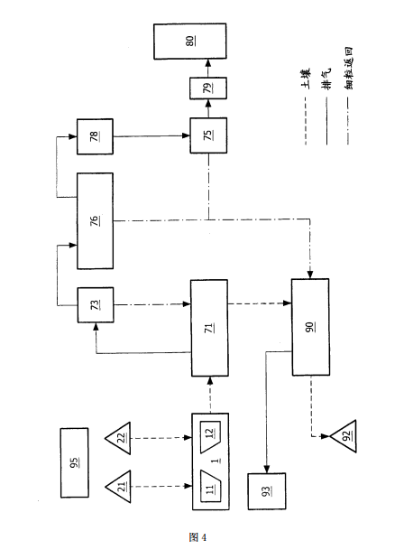 尾氣處理系統包括除塵設備,顆粒處理設備和尾氣排放設備,所述顆粒處理設備包括顆粒 凈化器和用于加熱所述顆粒凈化器內的顆粒并推動所述顆粒運動的燃燒室,所述燃燒室與 所述燃燒室與所述顆粒凈化器連接,所述顆粒凈化器設置有顆粒土壤進口,顆粒尾氣出口 和凈化器顆粒出口,所述顆粒土壤進口與所述除塵設備連接,所述顆粒尾氣出口與所述尾 氣排放設備連接。