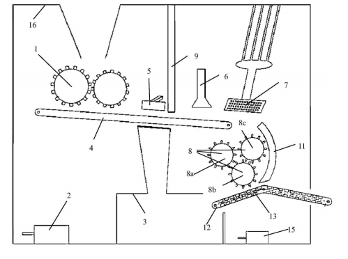 在污染土壤的修復過程中,最要的部分是將挖出的污染土壤進行土壤破碎成小顆粒 狀,并與修復藥水進行充分的接觸達到修復的目的。目前,土壤破碎很多并不充分,存在 大量塊狀土壤及碎石,不能達到充分修復的目的。為了克服現有技術中存在的不足,本實用新型提供一種用于土壤破碎 及修復的機械裝置,內部設置了多個破碎裝置、噴霧裝置和篩選裝置,可以有效的對土壤進行破碎和修復,同時剔除大塊碎石,減少對機器的損耗,同時保證更好的已修復土壤。