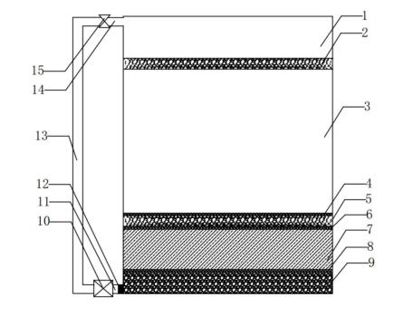 圖中:1、淋洗液儲(chǔ)備室2、第一石英砂層3、砷污染土壤層4、第一尼龍紗布層 ;5、第二石英砂層6、第二尼龍紗布層7、阻隔材料層8、第三尼龍紗布層9、第三石英砂層10、泵11、下端出水口12、微孔濾板13、連接管14、上端進(jìn)水口15、閥。