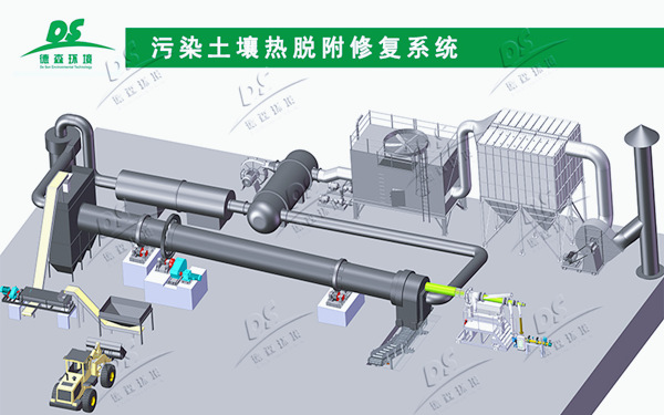 通過加熱污染土壤使其污染組分達到沸點溫度以上,控制系統溫度和物料停留時間促使污染物分階段氣化蒸發,最終與土壤介質分離。分離后的氣化污染組分再通過吸附、化學反應、焚燒等方式做進一步達標處理。脫附后的土壤固料可以原位回填或用作生產建筑骨料原料。整套熱脫附修復系統包括:供料系統、熱源系統、熱脫附旋轉窯系統、二燃室系統、尾氣收集除塵系統、余熱循環利用系統等;實際工藝將根據污染土壤案例具體情況優化調整,以實現最優化工藝設計及設備配套。