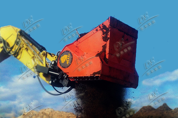 土壤破碎篩分鏟斗是專門為小型主機設計生產的篩分鏟斗,裝配于挖掘機、裝載機上的多功能附具,可以進行篩分,破碎,混合,曝氣等多種作業,只需要駕駛員在主機駕駛室內一步操作完成。
