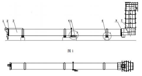 回轉(zhuǎn)窯土壤熱脫附設(shè)備包括筒體,所述筒體沿其中軸線方向傾斜地安裝在數(shù)對(duì)托輪上,筒體低端口處設(shè)有口護(hù)板并形成套筒空間,筒體通過(guò)套筒空間連接燃燒室,所述燃燒室與筒體之間設(shè)有尾部密封裝置,沿所述筒體長(zhǎng)度方向上套接數(shù)個(gè)矩形輪帶,所述矩形輪帶連接下方的支承裝置,所述筒體高端口處設(shè)有進(jìn)料罩,所述進(jìn)料罩與筒體之間設(shè)置有頭部密封裝置,在所述筒體中后部固定有用于傳遞轉(zhuǎn)矩大齒圈,所述大齒圈通過(guò)節(jié)向彈簧板與筒體懸掛聯(lián)接,所述筒體中部設(shè)置有傳動(dòng)裝置,所述傳動(dòng)裝置由電動(dòng)機(jī)、連接電動(dòng)機(jī)的減速器、以及通過(guò)聯(lián)軸器連接減速器輸出軸的小齒輪組成,所述小齒輪與大齒圈嚙合傳動(dòng)。